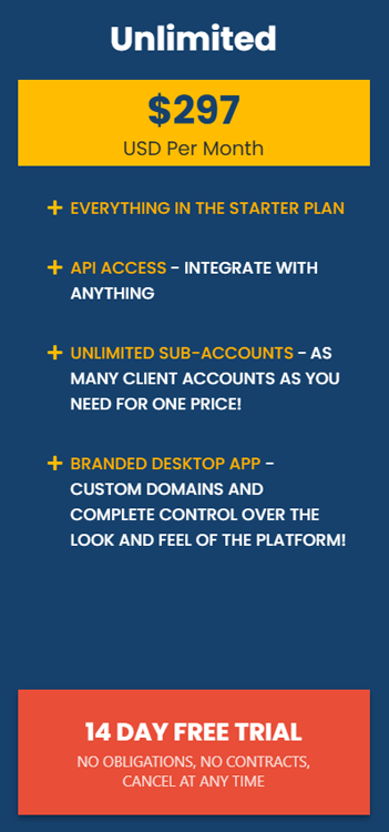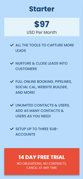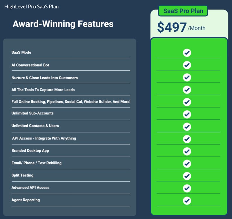 Go High Level offers different pricing tiers to accommodate various business needs, starting at $97 per month for the starter plan, $297/mo for an Unlimited plan, and $497/mo for the SaaS plan which allows additional functionality for rebilling your customers.